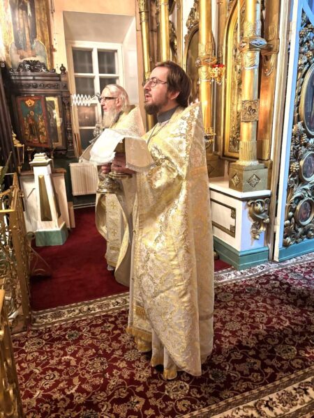 Божественную литургию совершили почетный настоятель протоиерей Владимир Петровский и настоятель иерей Александр Державич. По окончании богослужения и крестного хода отец Александр обратился к собравшимся с проповедью.
